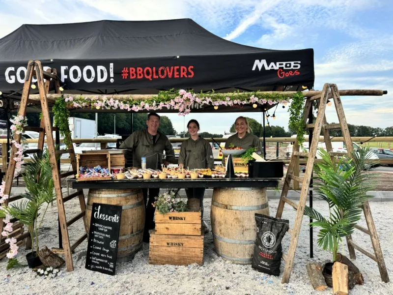 Wat deze barbecue extra bijzonder maakt, is de aankleding en uitstraling. Wij verzorgen een compleet gestylde setting met onder andere planten, bloemen en robuuste houten tafelbladen op wijnvaten. Alles is gericht op een warme, typische festivalsfeer waarin gasten zich vrij kunnen bewegen en genieten.