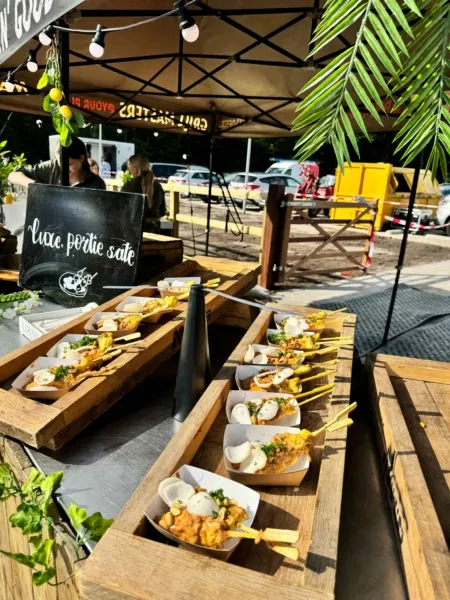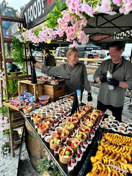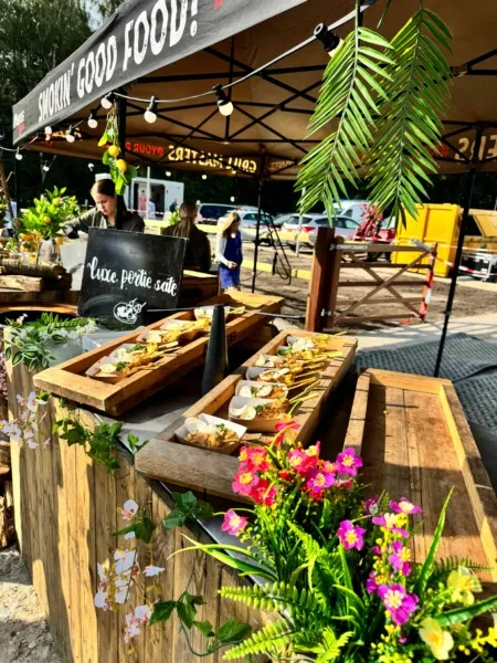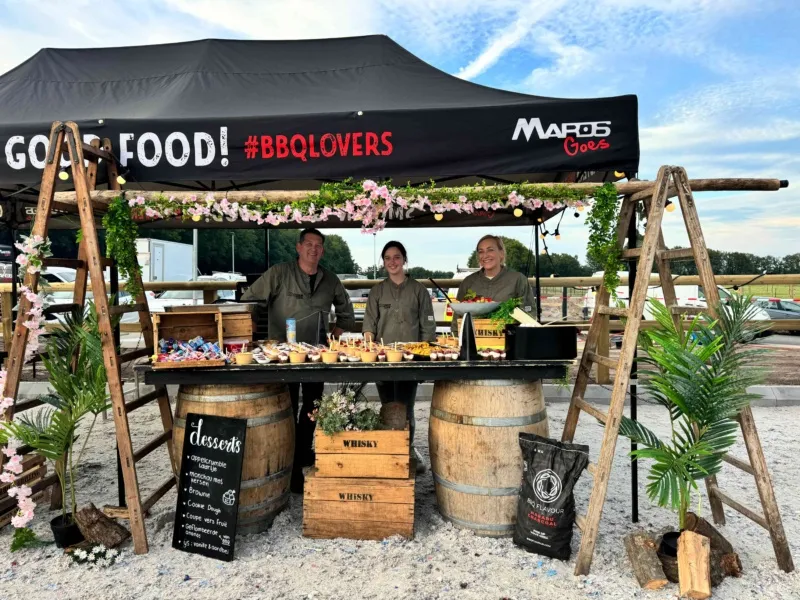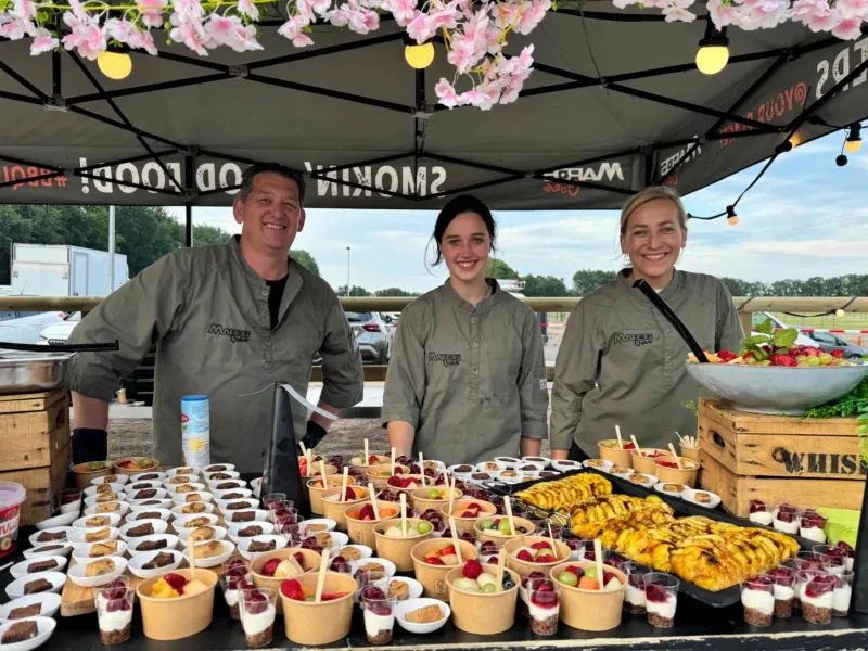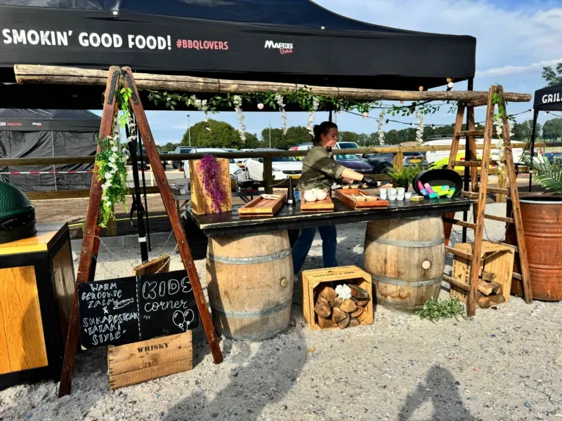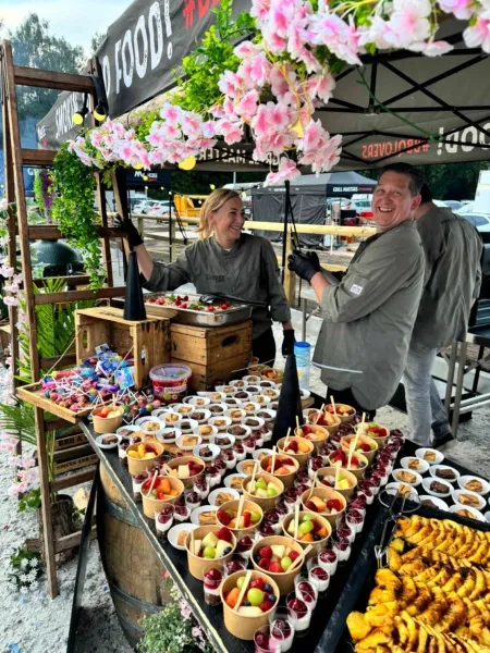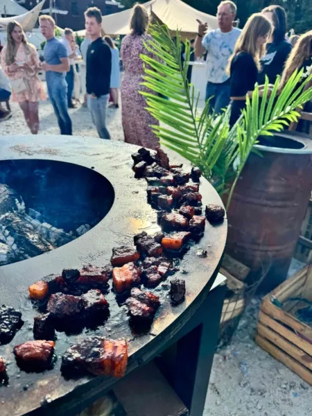 Verspreid over het terrein stonden onze Big Green Eggs en OFYR opgesteld, waar onze chefs live aan het werk waren. De geur van open vuur en ambachtelijke bereidingen zorgde direct voor een ontspannen en levendige sfeer. Op het menu stonden onder andere luxe porties saté, malse sucade steak, perfect gegaarde zalm met frisse pastasalade, een selectie van ribs en wings en nog veel meer. Gerechtjes die perfect passen bij deze setting, met de kwaliteit en aandacht die je van Vuurmeesters mag verwachten.