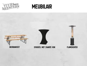 Vuurmeesters verzorgt passend meubilair en tenten om jouw evenement compleet te maken. Van robuuste tafels en (sta)meubilair in verschillende stijlen tot een aluminiumhal of stretchtent. Alles is beschikbaar op aanvraag en wordt afgestemd op de sfeer van jouw event.